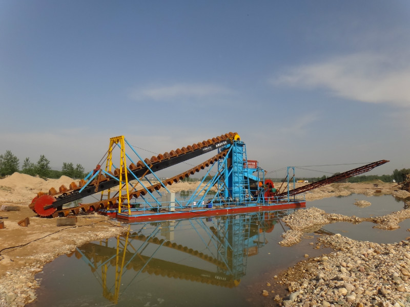 鏈斗式挖沙水洗船的船體使用拼裝式箱型結(jié)構(gòu),在配有挖掘裝置、篩選裝置、提升裝置、傳送裝置等裝置。鏈斗式挖沙船利用電機(jī)驅(qū)動(dòng)挖斗上料。鏈斗式挖沙水洗船在實(shí)現(xiàn)河沙的挖掘水洗篩分的過(guò)程之后,可以通過(guò)揚(yáng)沙泵或者輸送帶將河沙輸送到岸上。