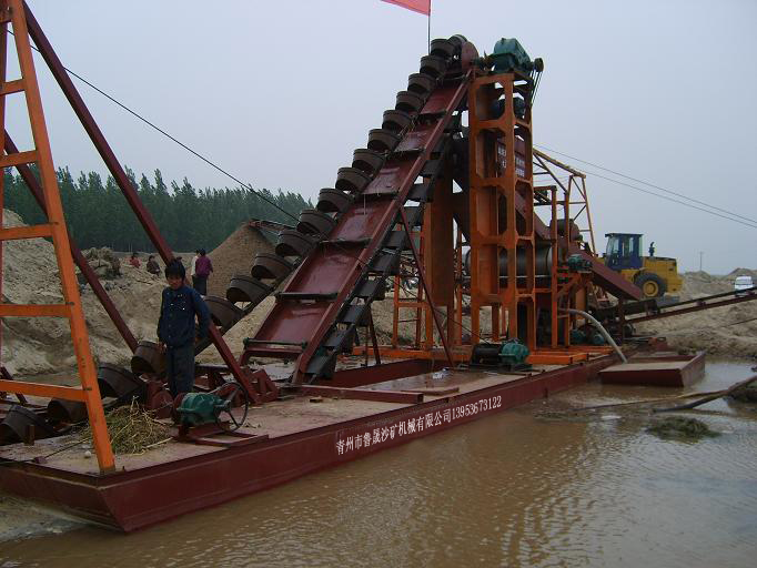 該船挖深:3-28米,船長:14-30米,產(chǎn)量:60-120立方米/小時,動力:30-120千瓦,篩沙用振動篩或滾動篩,磁選提取方式單磁選外,可加雙磁選機。 本船為非自航(可定制自航)、鏈斗式挖砂選鐵船,船體采用橫骨架式分體箱形結(jié)構(gòu),裝有定位錨設(shè)備及鏈斗驅(qū)動設(shè)備,由安裝在船體上的絞車升降橋架,通過鏈斗裝置把水下的礦砂挖上來,然后進(jìn)入圓篩進(jìn)行分離,再次經(jīng)加水稀釋、漂洗的砂漿均勻的給到磁選筒表面具有高磁力的選別區(qū),經(jīng)沖洗水沖掉附帶的河沙后被輸送到礦區(qū),磁性礦由水流沖到鐵砂收集箱,成為高品位的鐵砂,而非磁性鐵則不受磁力作用直接進(jìn)入尾礦槽排出,由此達(dá)到提取鐵粉的目的,動力由發(fā)電機組發(fā)電驅(qū)動。 回收鐵粉的同時可以回收黃金,可以將沙子輸送到岸邊。這都是可以根據(jù)客戶的要求來設(shè)計選型的。